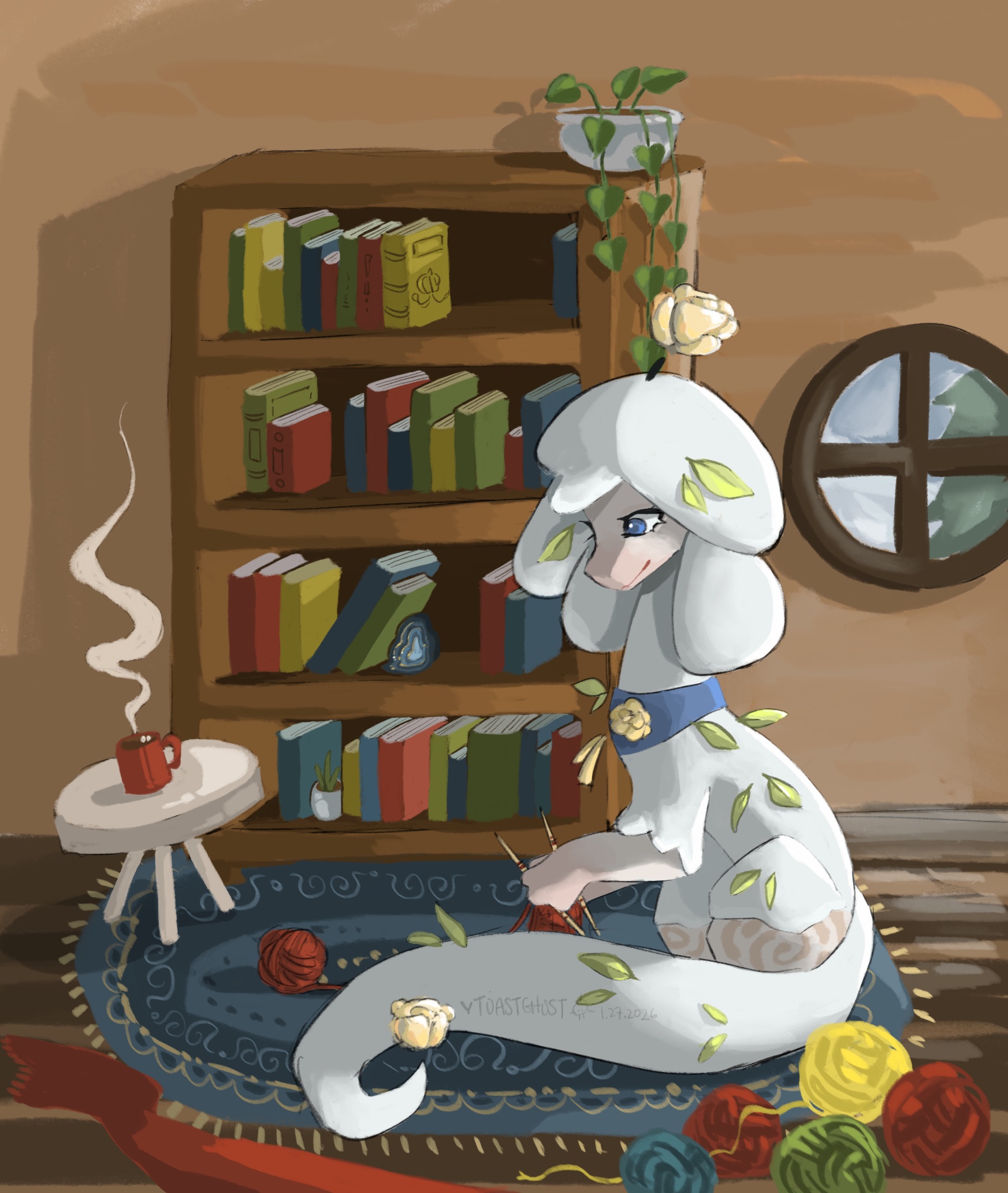 yay i'm finally drawing faia again! took a bit of a break cause it was application season but !! prompts!! this was super fun to do (albeit a little rushed lol) - mossflower29's "lace" knitting for the "knitting" prompt :)))