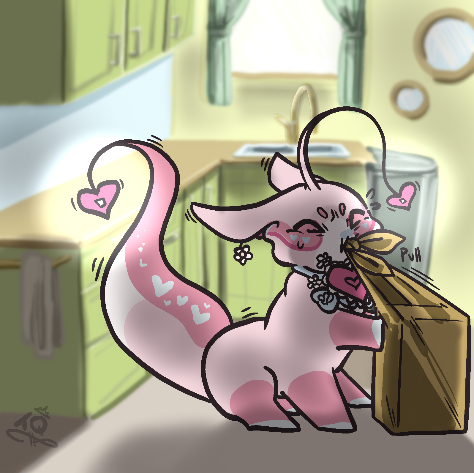 Flora helping to pack up a care kit for the guild members! Only she packed it way too heavy!