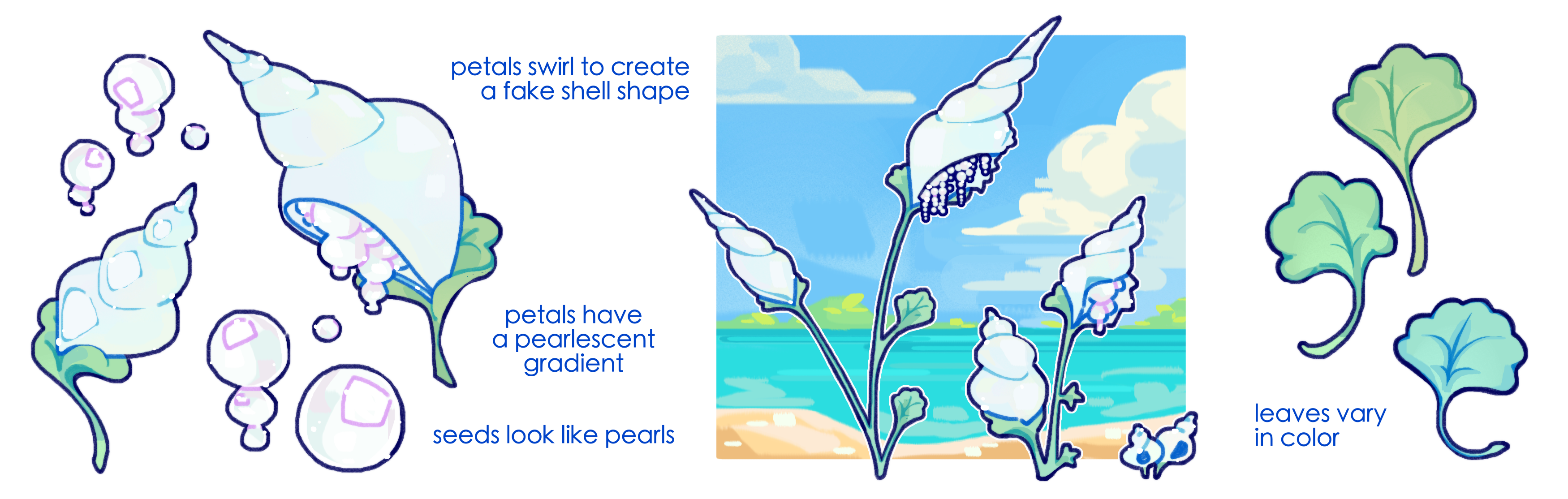 Beads of the Shore are delicate, melancholic flowers found exclusively at the very edge of Lylluna’s coastal lines. Their pearlescent petals mimic the texture of a shell, while their seeds bear an uncanny resemblance to pearls. However, their beauty is fleeting, with only a short active lifespan each year during Bay Season.